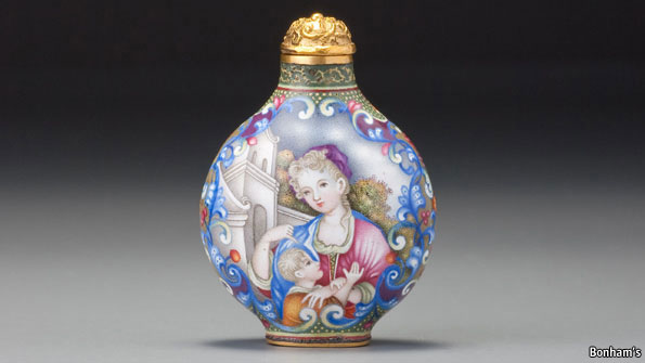 “IN A time when the market for Chinese treasures is constantly breaking records, the success of the sale of George and Mary Bloch’s snuff bottles in Hong Kong still caught many off-guard. The May 28th event marked the first so-called “golden gavel” sale in Hong Kong for Bonhams, a London auctioneer, meaning every lot found a buyer (also known as a “white-glove” auction in Europe and America). This is rare, and often limited to sales with few lots in highly collectible sectors. That this was a niche auction with 141 lots makes the feat all the more remarkable.”